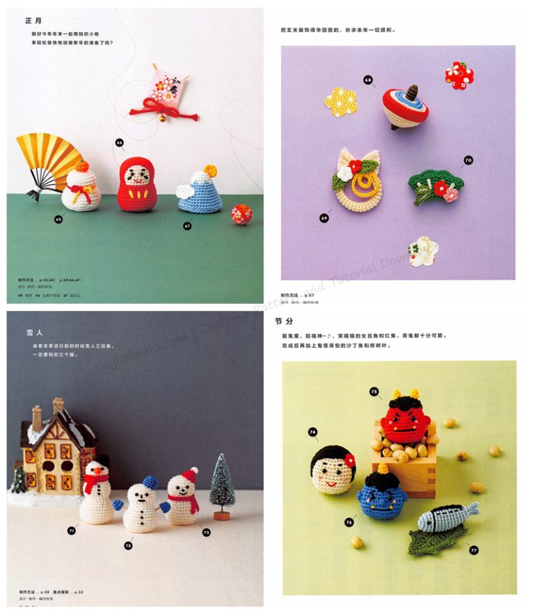 This book offers 77 seasonal  amigurumi patterns. All the crochet patterns in this book are in crochet symbol diagram form. Plus a basic crochet technique how-to instruction at the end of the book to help you with the crochet pattern.