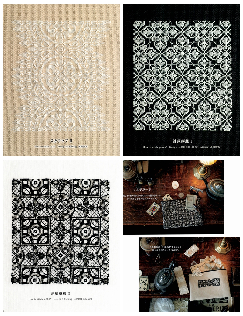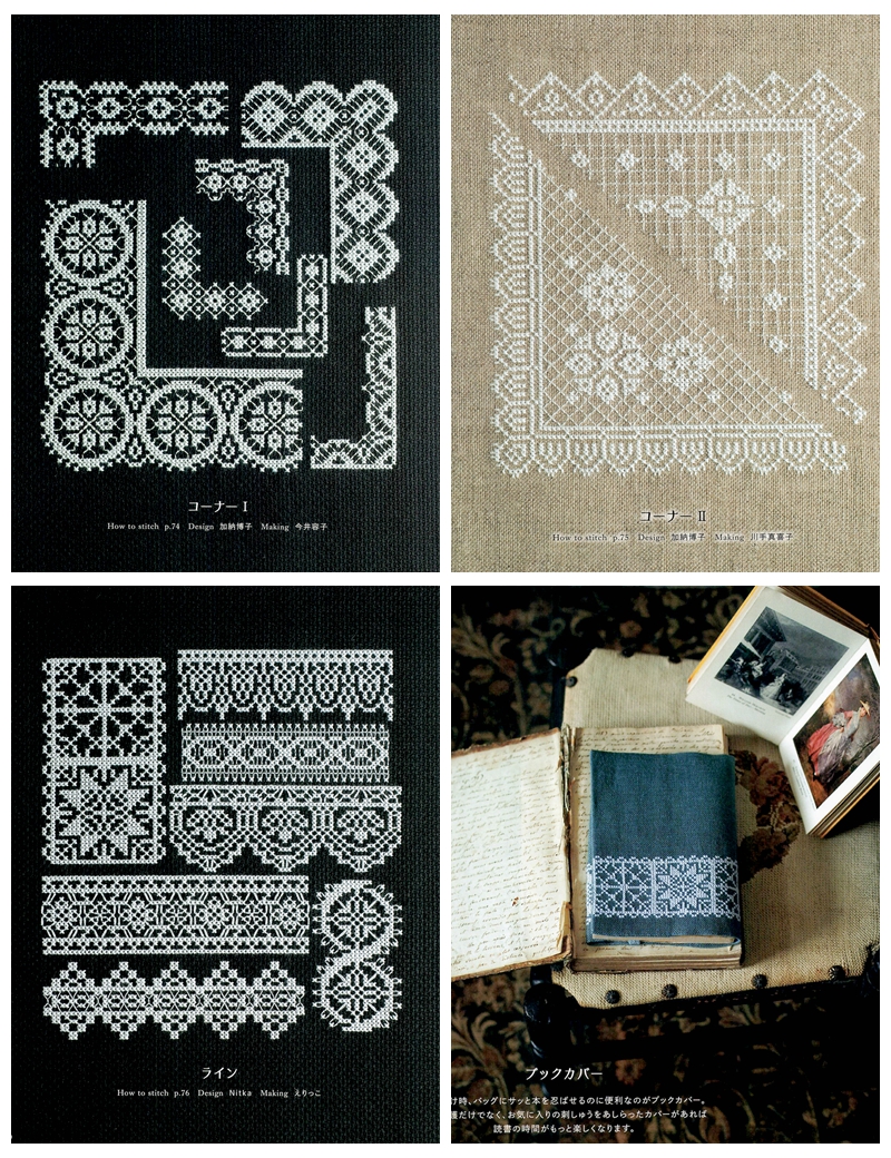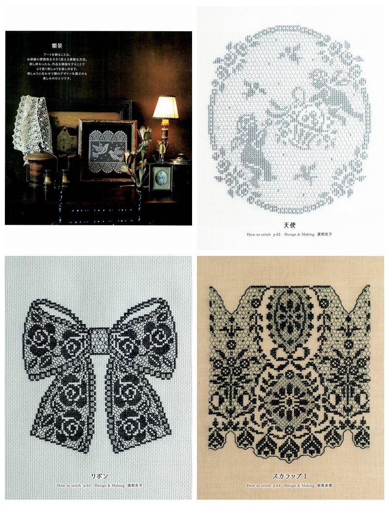 This stunning embroidery collection of cross stitch lace patterns is a refined Japanese embroidery book, featuring elegantly detailed designs that replicate the delicate beauty of antique lace through counted cross stitch. Worked primarily in monochrome thread on evenweave and Aida fabric, the cross stitch designs use dense gridwork, negative space, and fine geometric fills to create breathtaking lace-like textures on dark and neutral grounds.