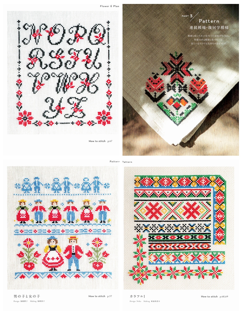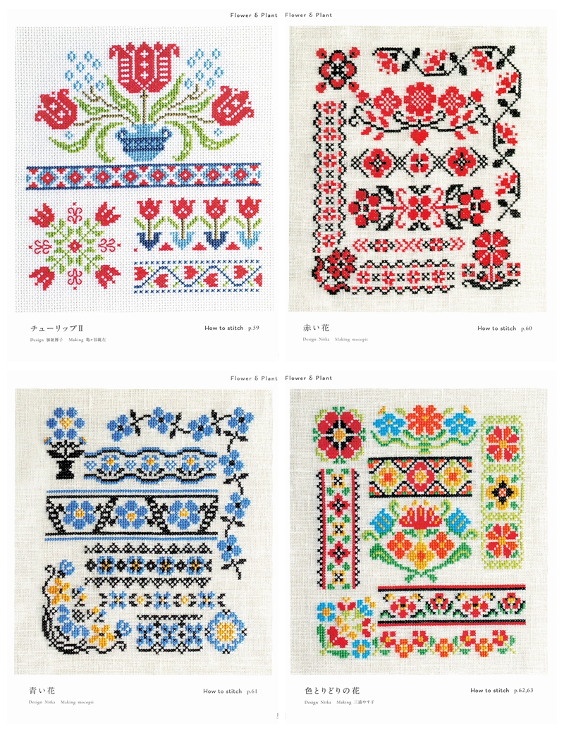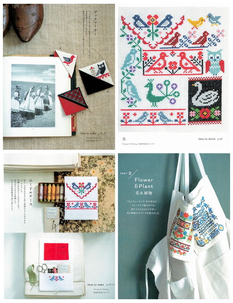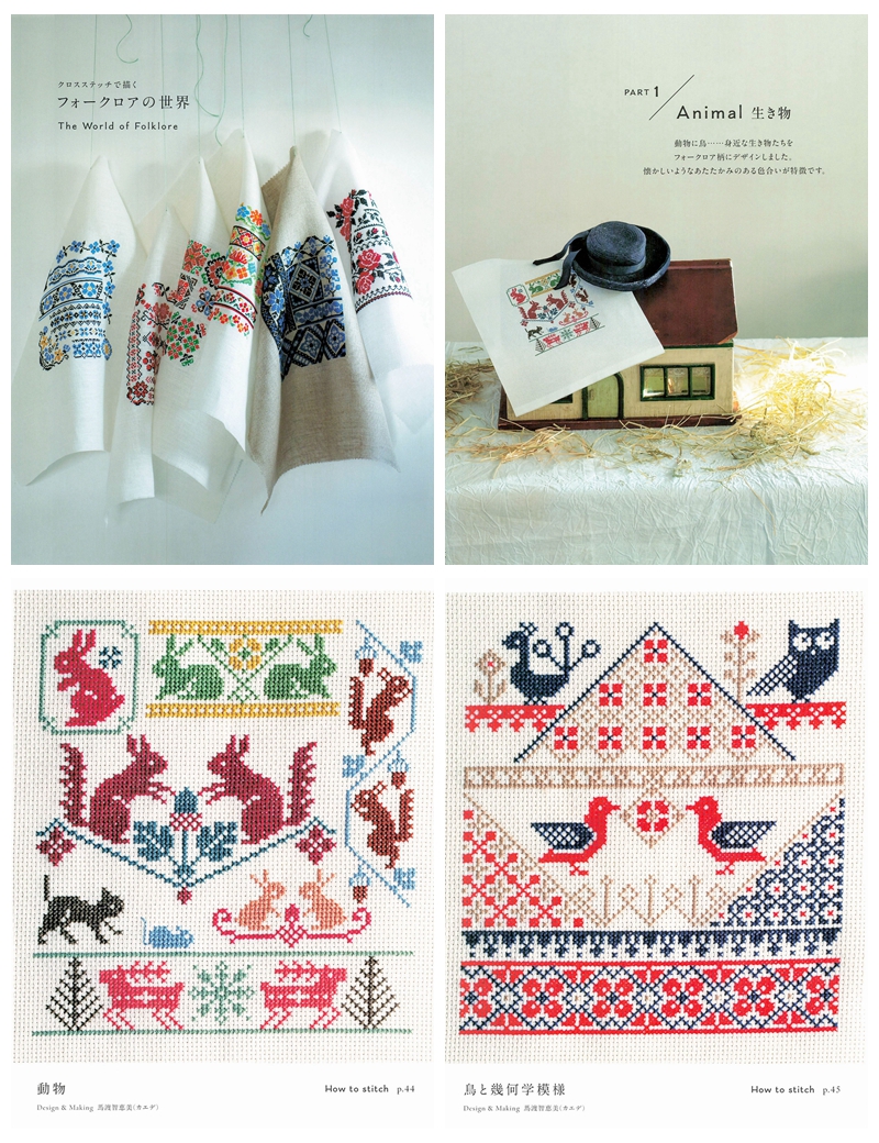 This Japanese craft book brings folklore cross stitch patterns to life through bold folk-art motifs rooted in Eastern European and Scandinavian traditions, worked entirely in cross stitch with rich, vibrant color palettes.