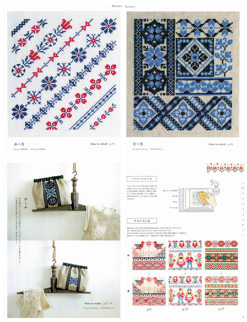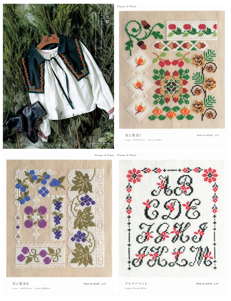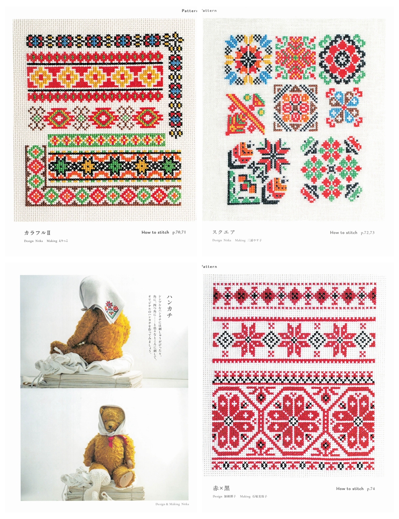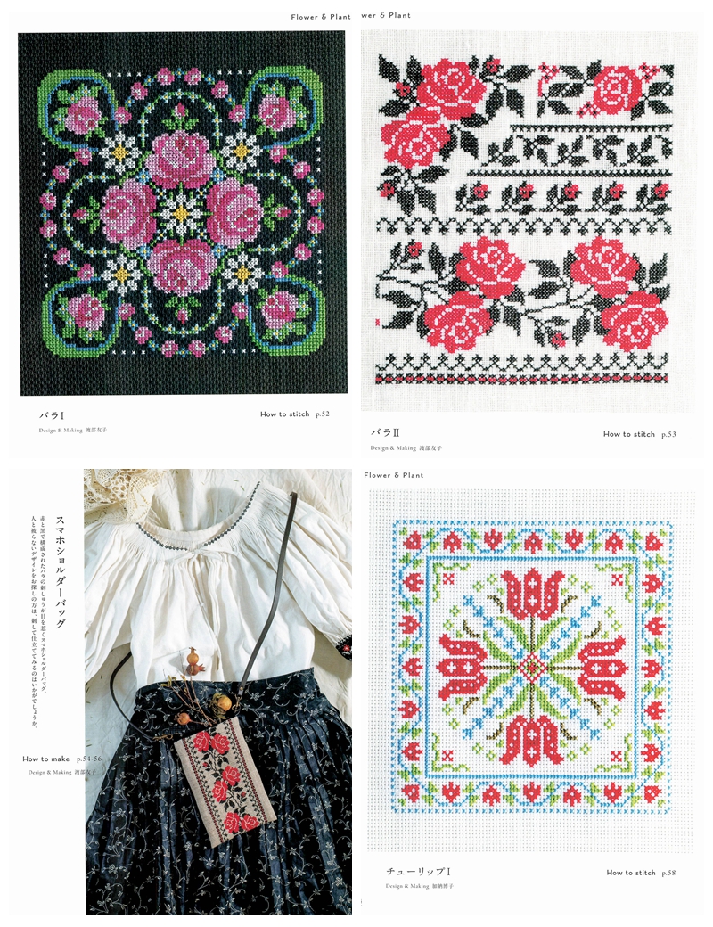 This Japanese craft book brings folklore cross stitch patterns to life through bold folk-art motifs rooted in Eastern European and Scandinavian traditions, worked entirely in cross stitch with rich, vibrant color palettes.