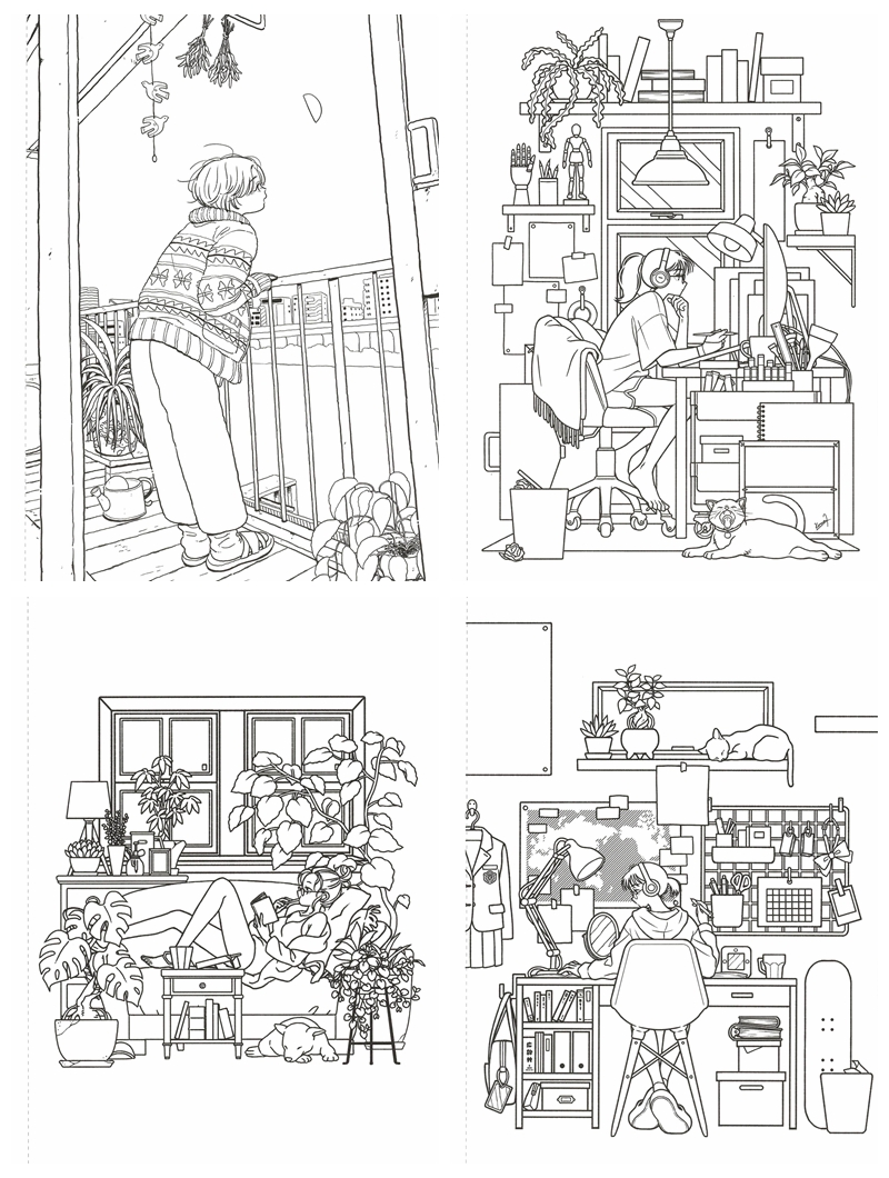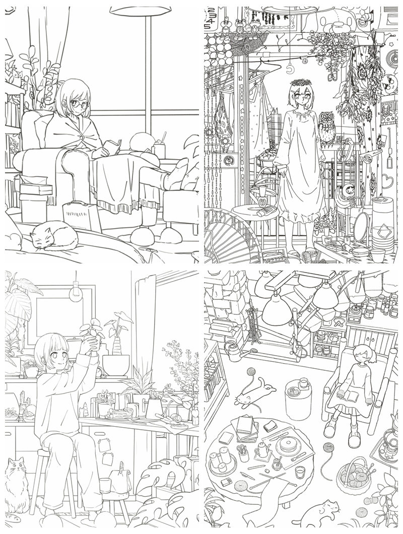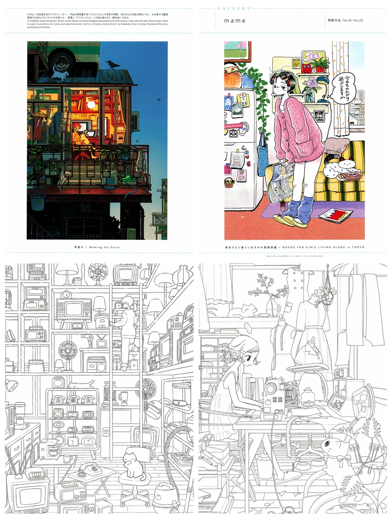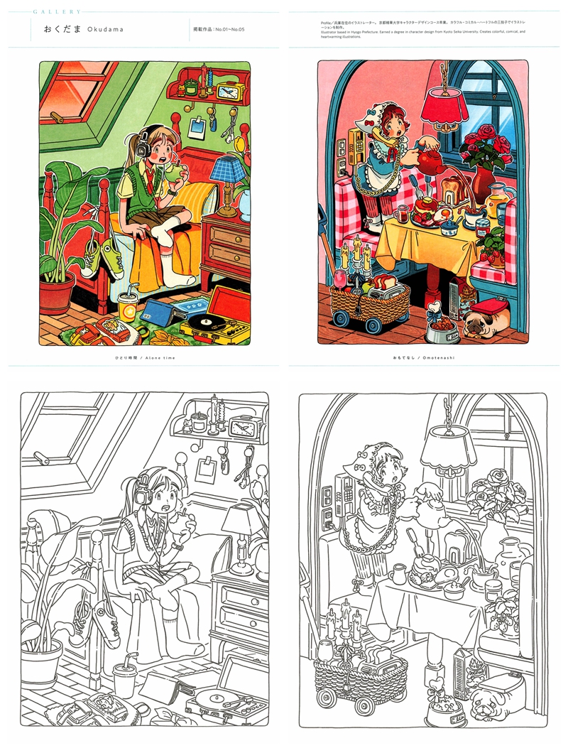 This Japanese anime coloring book is a charming Shoeisha anthology celebrating six talented illustrators — おくだま (Okudama), こまやま明, TAO, とろろとろろ, 松峰, and mame — each bringing their own distinct visual personality to the theme of everyday girlhood spaces. Every chapter opens with vibrant full-color reference illustrations before transitioning into beautifully detailed line art pages, spanning styles from retro pop and warm lofi interiors to densely packed Tokyo apartment aesthetics.