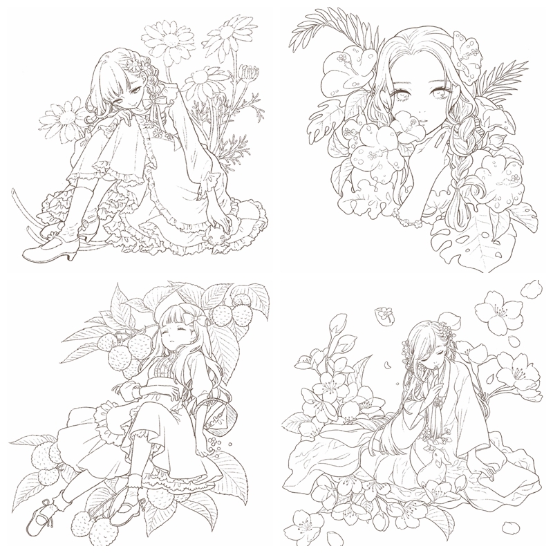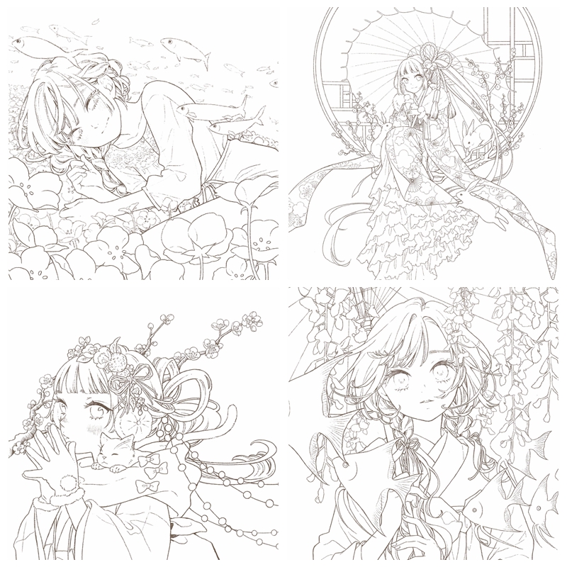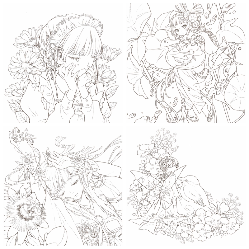 A breathtaking collection of delicate line art featuring “Flowers and Girls.” Illustrated by popular watercolor artist Yufuko, this book features dreamy, manga-style portraits filled with seasonal blooms, whimsical themes, and intricate details perfect for coloring. It contains 40 line drawings for coloring and 9 pages of color galleries for reference.