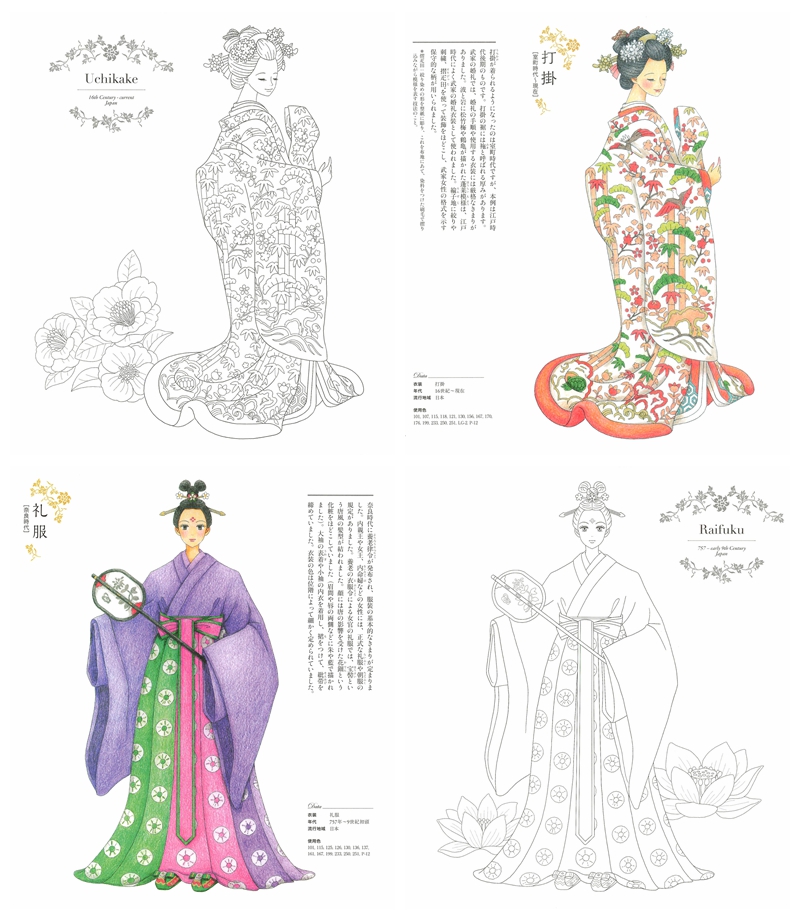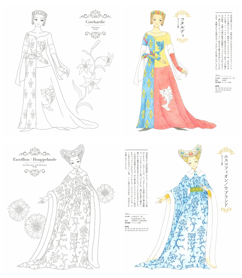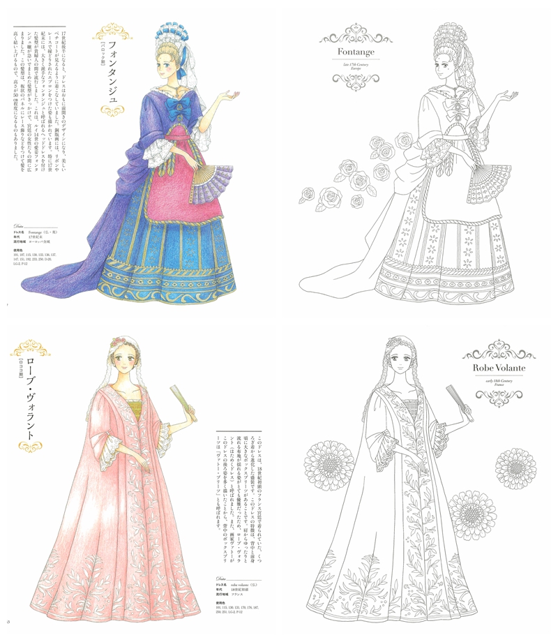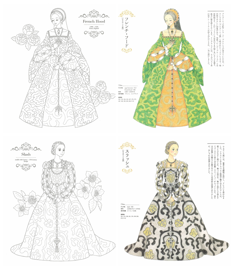This historical dress coloring book is a beautifully researched Japanese reference anthology supervised by fashion historian 好田由佳 and illustrated by 横尾飛鳥. Every entry pairs a detailed colored pencil reference illustration with a matching line art coloring page, covering a sweeping timeline of women’s fashion from medieval European court gowns to traditional Japanese kimono — making it as educational as it is artistic.