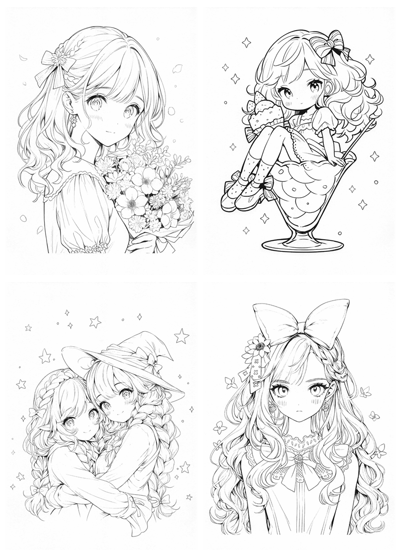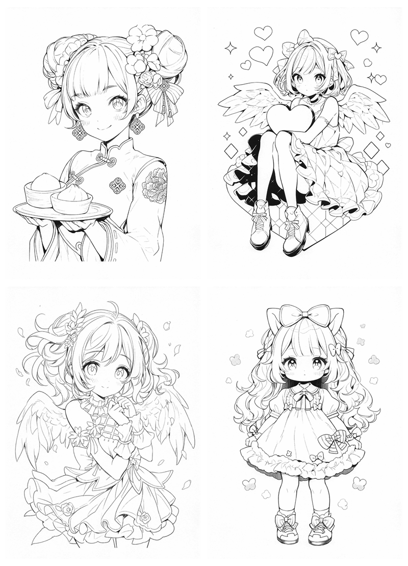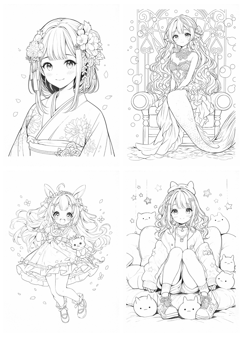 Each page features a different kawaii girl character, drawn with clean line art that is easy to color while still offering room for creativity. You’ll find a variety of themes, including dresses, fantasy wings, cozy moments, sweets, animals, and everyday scenes. The illustrations feel playful without being overwhelming, making them suitable for relaxed coloring sessions.