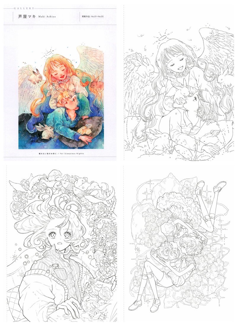 This Japanese fantasy coloring book is a breathtaking anthology , bringing together six celebrated Japanese illustrators — 芦屋マキ (Maki Ashiya), いろはあやの, kokuno, 淵, やまがみ彩, and yuko — each contributing their own uniquely enchanting chapter. Every section opens with a full-color reference illustration followed by detailed, print-ready line art pages, showcasing delicate anime-style draftsmanship with intricate floral, celestial, and dark fantasy elements.